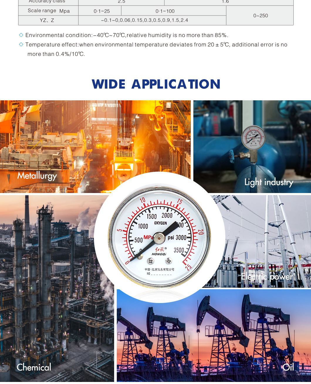 التطبيق: الصناعات الكيماوية والبتروكيماوية ، محطات الطاقة التقليدية والنووية ، المضخات ، آلات التنظيف المائي ، المطابع ، ضواغط المحرك ، التوربينات ، محركات الديزل ومحطات التبريد ، الأطعمة والمشروبات ، الصناعات الدوائية. لقياس الماء أو الزيت أو الغاز أو أي وسيط غير أكّال للنحاس الأصفر أو الفوسفور البرونزي.